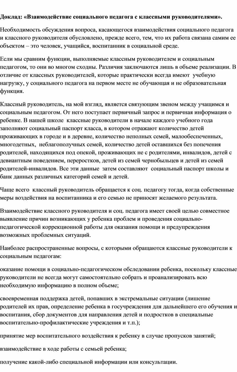 Доклад: «Взаимодействие социального педагога с классными руководителями».
