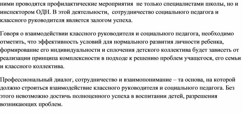 Говоря о взаимодействии классного руководителя и социального педагога, необходимо отметить, что эффективность условий для нормального развития личности ребенка, формирование его индивидуальности и сплочения детского коллектива будет зависеть от реализации принципа комплексности в подходе к решению проблем учащегося, его семьи и классного коллектива.