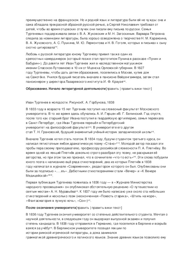 Ива́н Серге́евич Турге́нев (28 октября (9 ноября) 1818, Орёл, Российская империя — 22 августа (3 сентября) 1883, Буживаль,Франция) — русский писатель-реалист[6], поэт, публицист, драматург, переводчик[7]. Один из классиков русской литературы, внёсших наиболее значительный вклад в её развитие во второй половине XIX века[8]. Член-корреспондент императорской Академии наук по разряду русского языка и словесности (1860), почётный доктор Оксфордского университета (1879).доклад