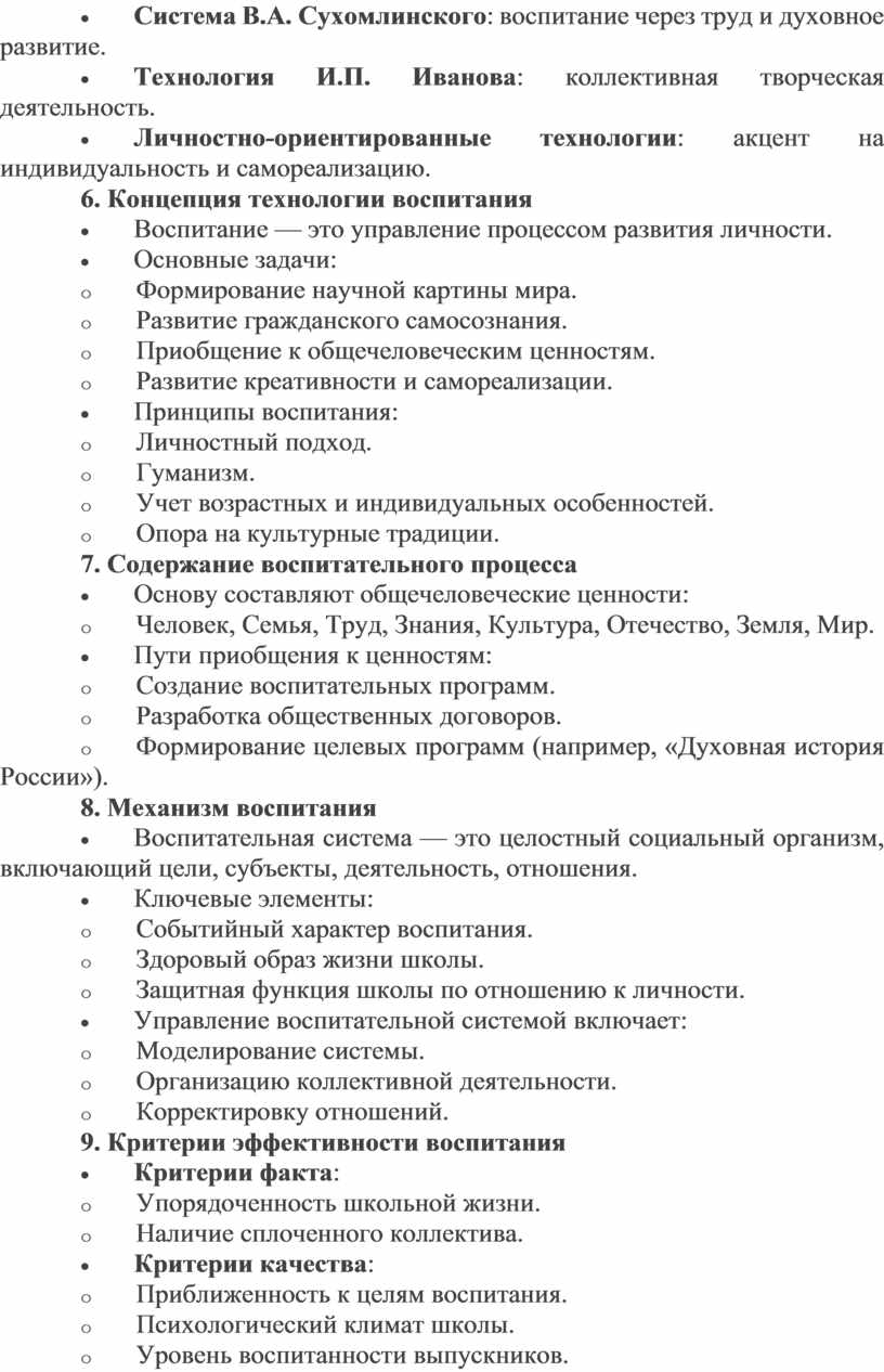 Педагогические технологии воспитания как самостоятельное направление сформировались в 70-е годы XX века. Они объединяют три ключевых процесса развития личности: управление учебной и воспитательной деятельностью, проектирование и анализ результатов работы. Основными критериями эффективности технологий воспитания являются их способность адаптироваться к конкретным условиям и обеспечивать индивидуальный подход к каждому ребёнку.
