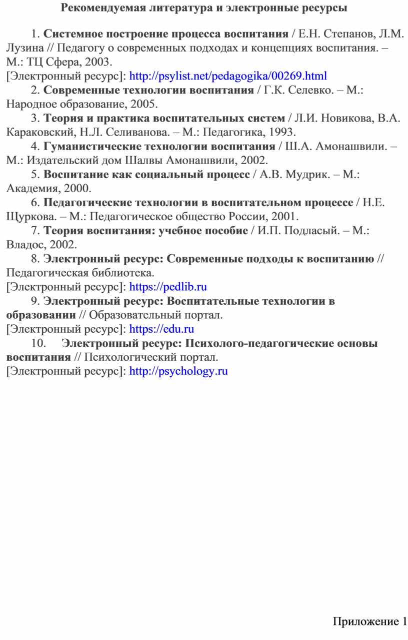 2. Современные технологии воспитания / Г.К. Селевко. – М.: Народное образование, 2005.