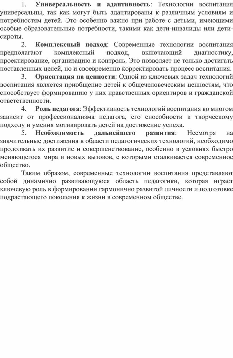 Таким образом, современные технологии воспитания представляют собой динамично развивающуюся область педагогики, которая играет ключевую роль в формировании гармонично развитой личности и подготовке подрастающего поколения к жизни в современном обществе.