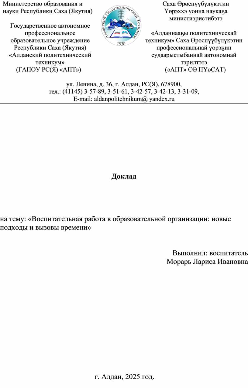 Государственное автономное профессиональное образовательное учреждение Республики Саха (Якутия) «Алданский политехнический техникум» (ГАПОУ РС(Я) «АПТ») |