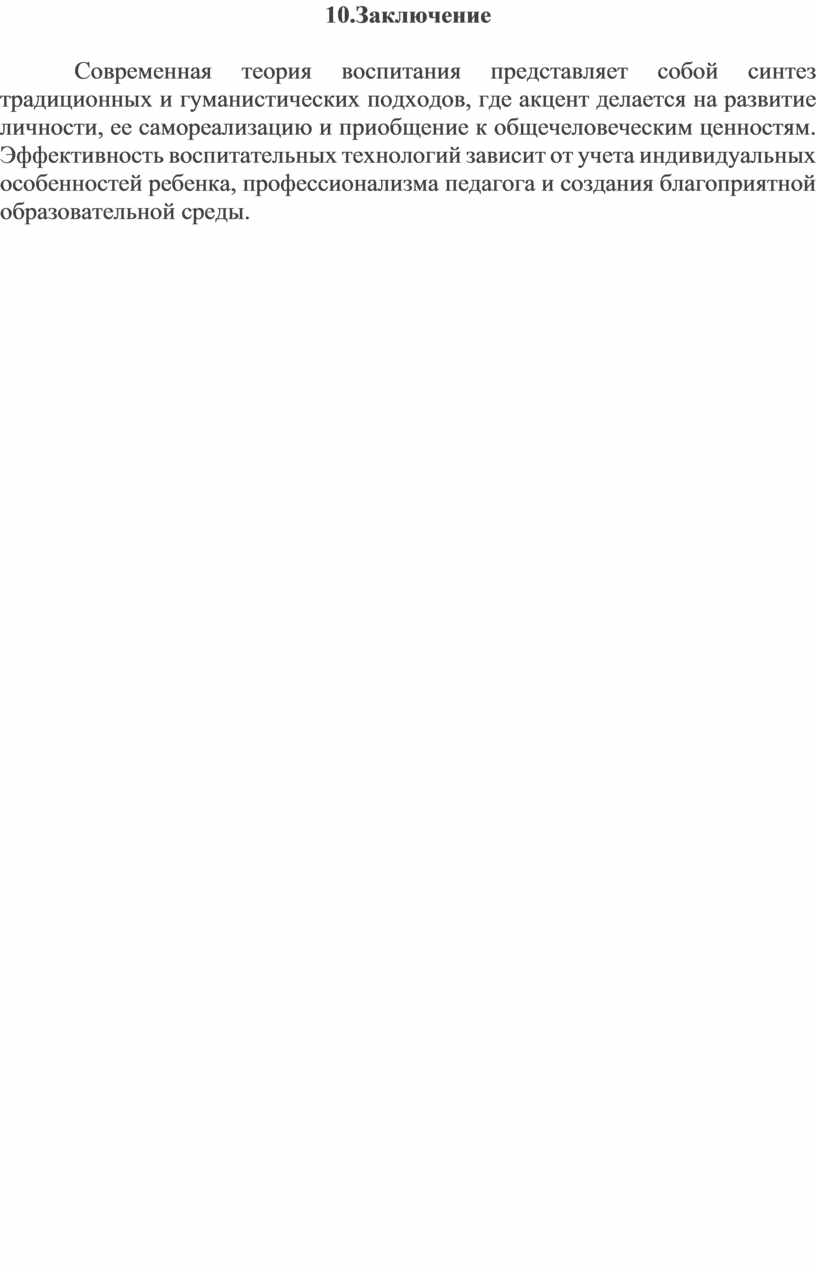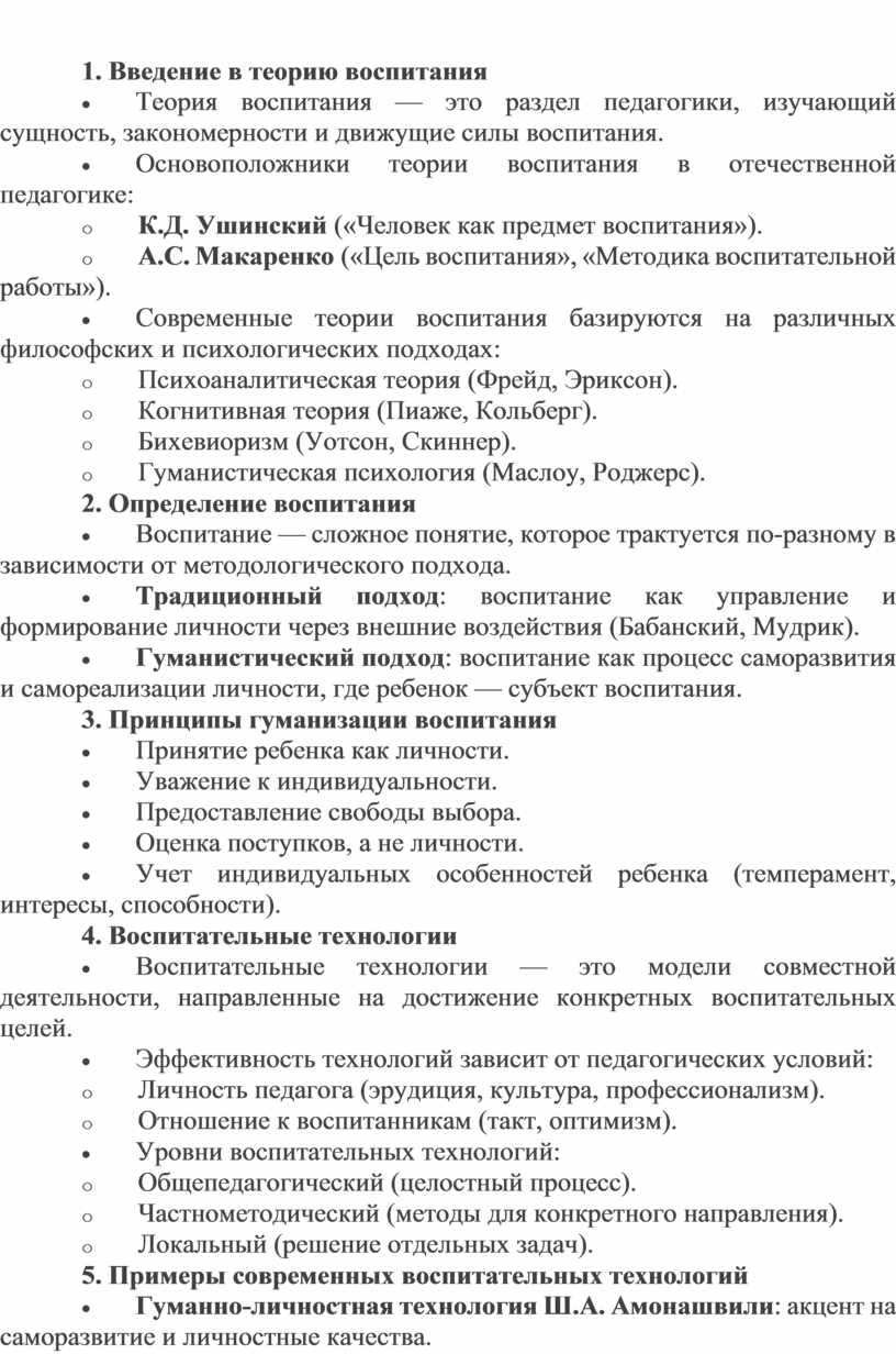 Современная теория воспитания представляет собой синтез традиционных и гуманистических подходов, где акцент делается на развитие личности, ее самореализацию и приобщение к общечеловеческим ценностям. Эффективность воспитательных технологий зависит от учета индивидуальных особенностей ребенка, профессионализма педагога и создания благоприятной образовательной среды.