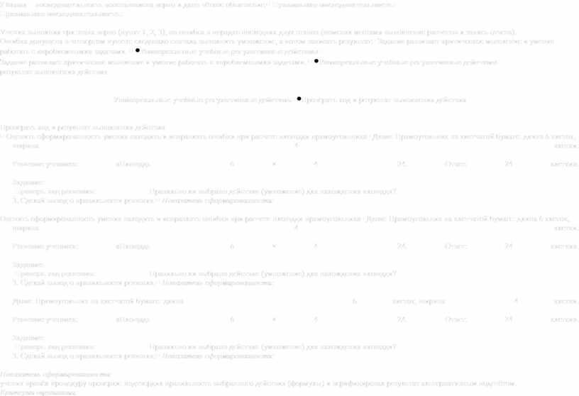 Правильная последовательность: 1, 2, 3,3,5,4 Ученик выполнил три этапа верно (пункт 1, 2, 3), но ошибся в порядке последних двух этапов (поменял местами выполнение расчетов и запись ответа). Ошибка допущена в четвертом пункте: следовало сначала выполнить умножение, а потом записать результат. |