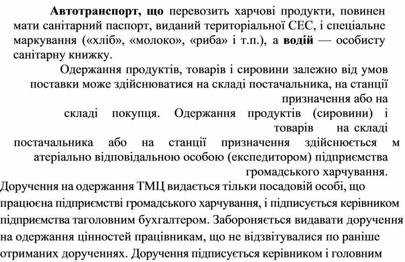 Автотранспорт, що перевозить харчові продукти, повинен мати санітарний паспорт, виданий територіальної СЕС, і спеціальне маркування («хліб», «молоко», «риба» і т.п.), а водій — особисту санітарну книжку.