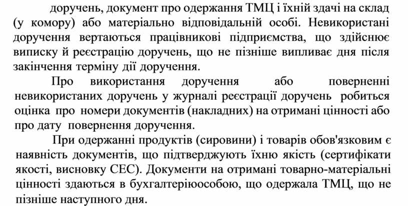 При одержанні продуктів (сировини) і товарів обов'язковим є наявність документів, що підтверджують їхню якість (сертифікати якості, висновку СЕС). Документи на отримані товарно-матеріальні цінності здаються в бухгалтерію особою, що одержала ТМЦ, що не пізніше наступного дня.