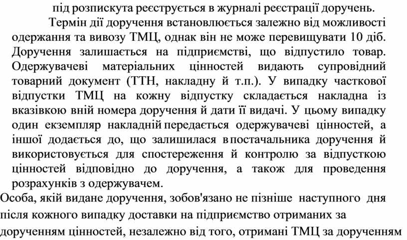 Термін дії доручення встановлюється залежно від можливості одержання та вивозу ТМЦ, однак він не може перевищувати 10 діб. Доручення залишається на підприємстві, що відпустило товар. Одержувачеві матеріальних цінностей видають супровідний товарний документ (ТТН, накладну й т.п.). У випадку часткової відпустки ТМЦ на кожну відпустку складається накладна із вказівкою в ній номера доручення й дати її видачі. У цьому випадку один екземпляр накладній передається одержувачеві цінностей, а іншої додається до, що залишилася в постачальника доручення й використовується для спостереження й контролю за відпусткою цінностей відповідно до доручення, а також для проведення розрахунків з одержувачем.