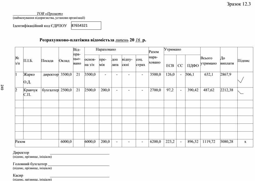 На основі табеля бухгалтерія розраховує та виплачує заробітну плату працівникам підприємства, з оформленням необхідних первинних документів (видаткові касові ордери, розрахунково-платіжні відомості (зразок 12.2), або платіжні відомості (зразок 12.3).