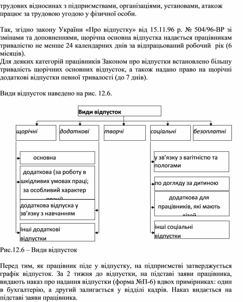 Так, згідно закону України «Про відпустку» від 15.11.96 р. № 504/96-ВР зі змінами та доповненнями, щорічна основна відпустка надається працівникам тривалістю не менше 24 календарних днів за відпрацьований робочий рік (6 місяців).