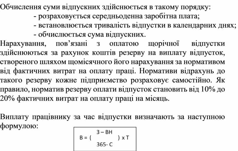 Нарахування, пов’язані з оплатою щорічної відпустки здійснюються за рахунок коштів резерву на виплату відпусток, створеного шляхом щомісячного його нарахування за нормативом від фактичних витрат на оплату праці. Нормативи відрахунь до такого резерву кожне підприємство розраховує самостійно. Як правило, норматив резерву оплати відпусток становить від 10% до 20% фактичних витрат на оплату праці на місяць.