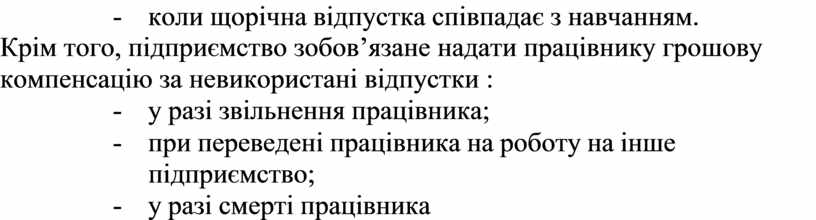 - наданні працівникам щорічної відпустки, додаткових відпусток у зв’язку з навчанням, додаткової відпустки працівникам, які мають дітей, або виплати їм компенсації за невикористані відпустки;