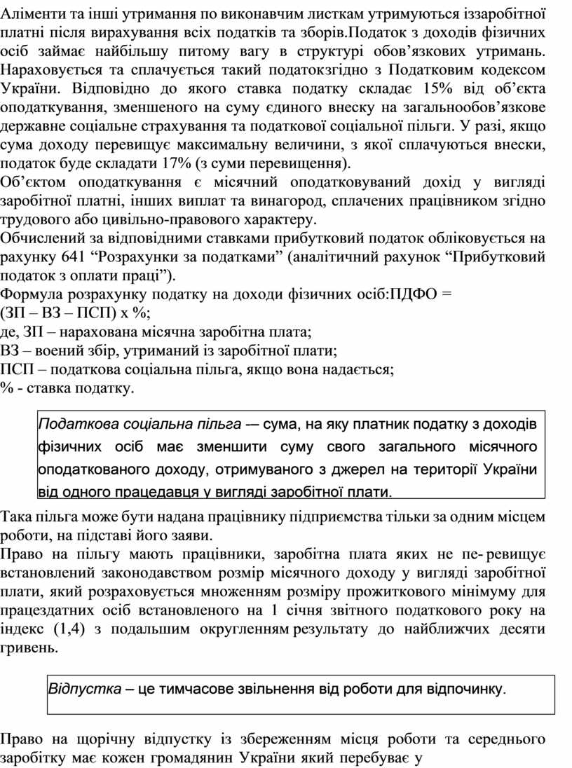 Аліменти та інші утримання по виконавчим листкам утримуються із заробітної платні після вирахування всіх податків та зборів.Податок з доходів фізичних осіб займає найбільшу питому вагу в структурі обов’язкових утримань. Нараховується та сплачується такий податок згідно з Податковим кодексом України. Відповідно до якого ставка податку складає 15% від об’єкта оподаткування, зменшеного на суму єдиного внеску на загальнообов’язкове державне соціальне страхування та податкової соціальної пільги. У разі, якщо сума доходу перевищує максимальну величини, з якої сплачуються внески, податок буде складати 17% (з суми перевищення).