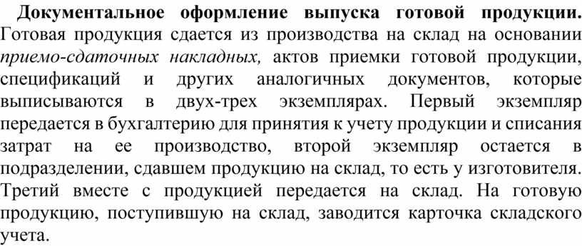 Документальное оформление выпуска готовой продукции. Готовая продукция сдается из производства на склад на основании приемо-сдаточных накладных, актов приемки готовой продукции, спецификаций и других аналогичных документов, которые выписываются в двух-трех экземплярах. Первый экземпляр передается в бухгалтерию для принятия к учету продукции и списания затрат на ее производство, второй экземпляр остается в подразделении, сдавшем продукцию на склад, то есть у изготовителя. Третий вместе с продукцией передается на склад. На готовую продукцию, поступившую на склад, заводится карточка складского учета.