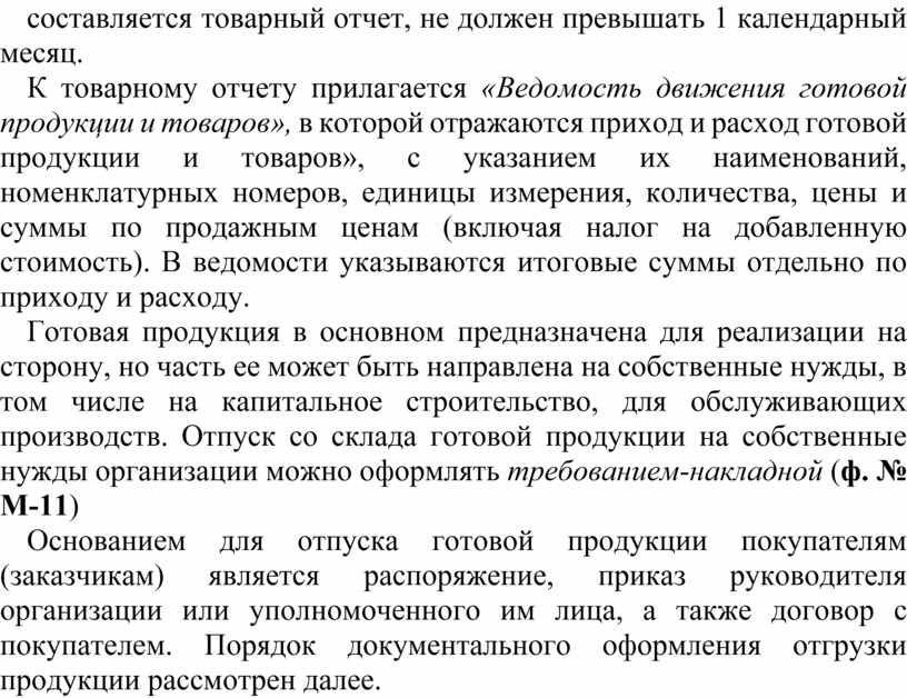 В массовом производстве на многих предприятиях готовую продукцию передают из цеха на склад многократно в течение смены. В этом случае кроме накладной применяется ведомость сдачи готовой продукции. Передача готовой продукции в торговое подразделение организации оформляется требованием-накладной. При продаже готовой продукции через структурное подразделение (магазин, торговый дом, павильон) производственные организации могут использовать следующие первичные документы: товарный отчет и ведомость движения готовой продукции. Период, за который составляется товарный отчет, не должен превышать 1 календарный месяц.