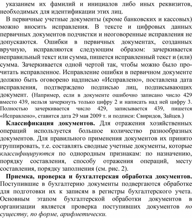 В первичные учетные документы (кроме банковских и кассовых) можно вносить исправления. В тексте и цифровых данных первичных документов подчистки и неоговоренные исправления не допускаются. Ошибки в первичных документах, созданных вручную, исправляются следующим образом: зачеркивается неправильный текст или сумма, пишется исправленный текст и (или) сумма. Зачеркивается одной чертой так, чтобы можно было прочитать исправленное. Исправление ошибки в первичном документе должно быть оговорено надписью «Исправлено», поставлена дата исправления, подтверждено подписью лиц, подписывающих документ. (Например, если в документе ошибочно записано число 429 вместо 439, нельзя зачеркнуть только цифру 2 и написать над ней цифру 3. Полностью зачеркивается число 429, записывается 439, пишется «Исправлено», ставится дата 29 мая 2009 т. и подписи: Свиридов, Зайцев.)