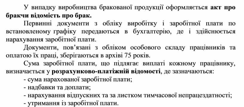 Сума заробітної плати, що підлягає виплаті кожному працівнику, визначається у розрахунково-платіжній відомості, де зазначаються: