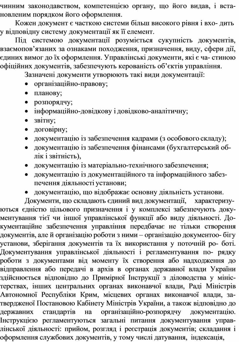 ються єдністю цільового призначення і у комплексі забезпечують доку- ментування тієї чи іншої управлінської функції або виду діяльності. До- кументаційне забезпечення управління передбачає не тільки створення документів, але й організацію роботи з ними – організацію документоо- бігу установи, зберігання документів та їх використання у поточній ро- боті. Документування управлінської діяльності і регламентування по- рядку роботи з документами від моменту їх створення або надходження до відправлення або передачі в архів в органах державної влади України здійснюється відповідно до Примірної Інструкції з діловодства у мініс- терствах, інших центральних органах виконавчої влади, Раді Міністрів Автономної Республіки Крим, місцевих органах виконавчої влади, за- твердженої Постановою Кабінету Міністрів України, а також відповідно до державних стандартів на організаційно-розпорядчу документацію. Інструкцією регламентуються загальні питання документування управ- лінської діяльності: прийом, розгляд і реєстрація документів; складання і оформлення службових документів, у тому числі датування, індексація,