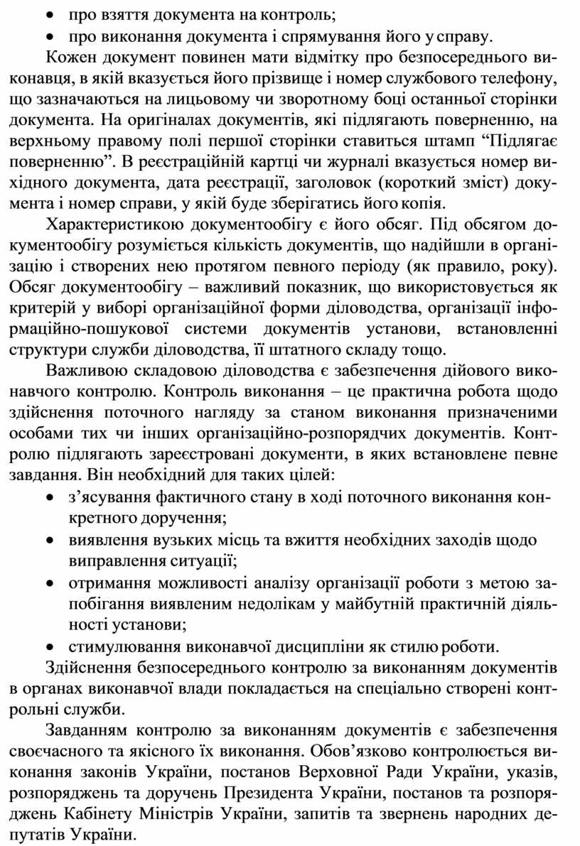 Завданням контролю за виконанням документів є забезпечення своєчасного та якісного їх виконання. Обов’язково контролюється ви- конання законів України, постанов Верховної Ради України, указів, розпоряджень та доручень Президента України, постанов та розпоря- джень Кабінету Міністрів України, запитів та звернень народних де- путатів України.