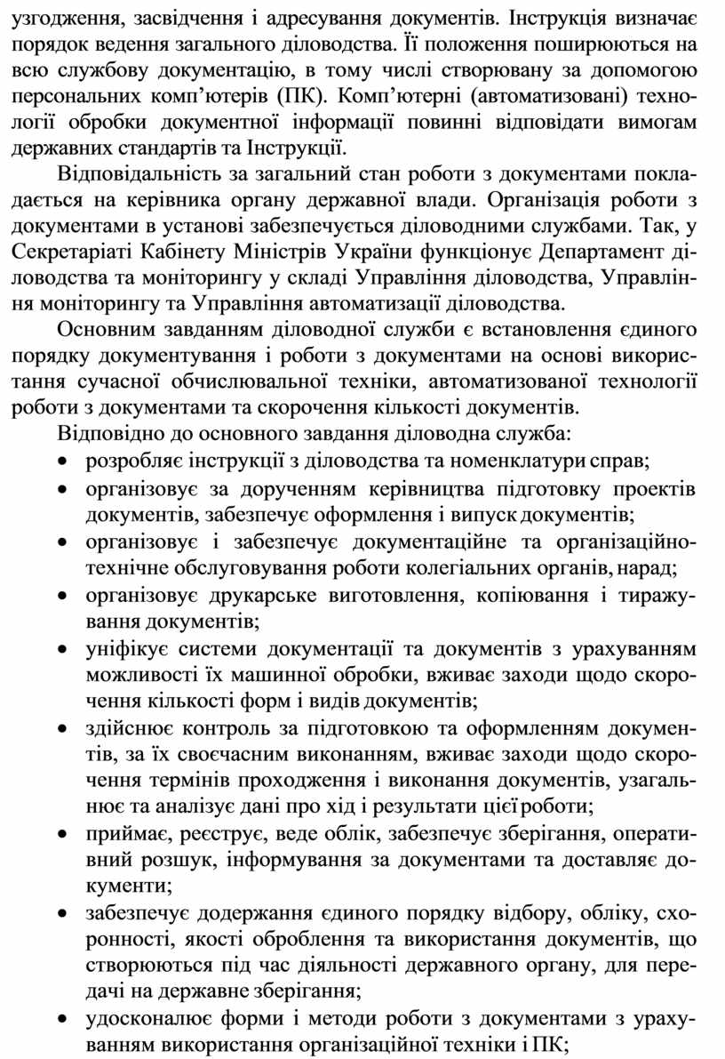 узгодження, засвідчення і адресування документів. Інструкція визначає порядок ведення загального діловодства. Її положення поширюються на всю службову документацію, в тому числі створювану за допомогою персональних комп’ютерів (ПК). Комп’ютерні (автоматизовані) техно- логії обробки документної інформації повинні відповідати вимогам державних стандартів та Інструкції.