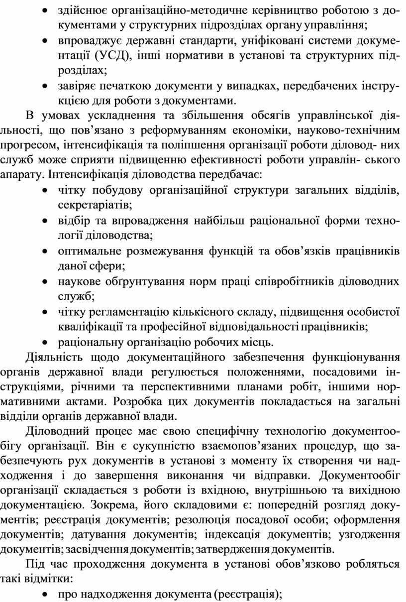 В умовах ускладнення та збільшення обсягів управлінської дія- льності, що пов’язано з реформуванням економіки, науково-технічним прогресом, інтенсифікація та поліпшення організації роботи діловод- них служб може сприяти підвищенню ефективності роботи управлін- ського апарату. Інтенсифікація діловодства передбачає: