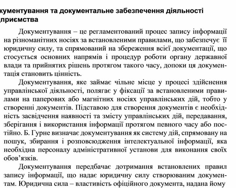 Документування, яке займає чільне місце у процесі здійснення управлінської діяльності, полягає у фіксації за встановленими прави- лами на паперових або магнітних носіях управлінських дій, тобто у створенні документів. Підставою для створення документів є необхід- ність засвідчення наявності та змісту управлінських дій, передавання, зберігання і використання інформації протягом певного часу або пос- тійно. Б. Гурне визначає документування як систему дій, спрямовану на пошук, збирання і розповсюдження інтелектуальної інформації, яка необхідна персоналу адміністративної установи для виконання своїх обов’язків.