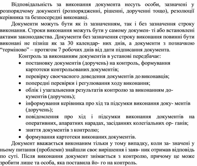 Документи можуть бути як із зазначенням, так і без зазначення строку виконання. Строки виконання можуть бути у самому докумен- ті або встановлені актами законодавства. Документи без зазначення строку виконання повинні бути виконані не пізніш як за 30 календар- них днів, а документи з позначкою “терміново” – протягом 7 робочих днів від дати підписання документа.