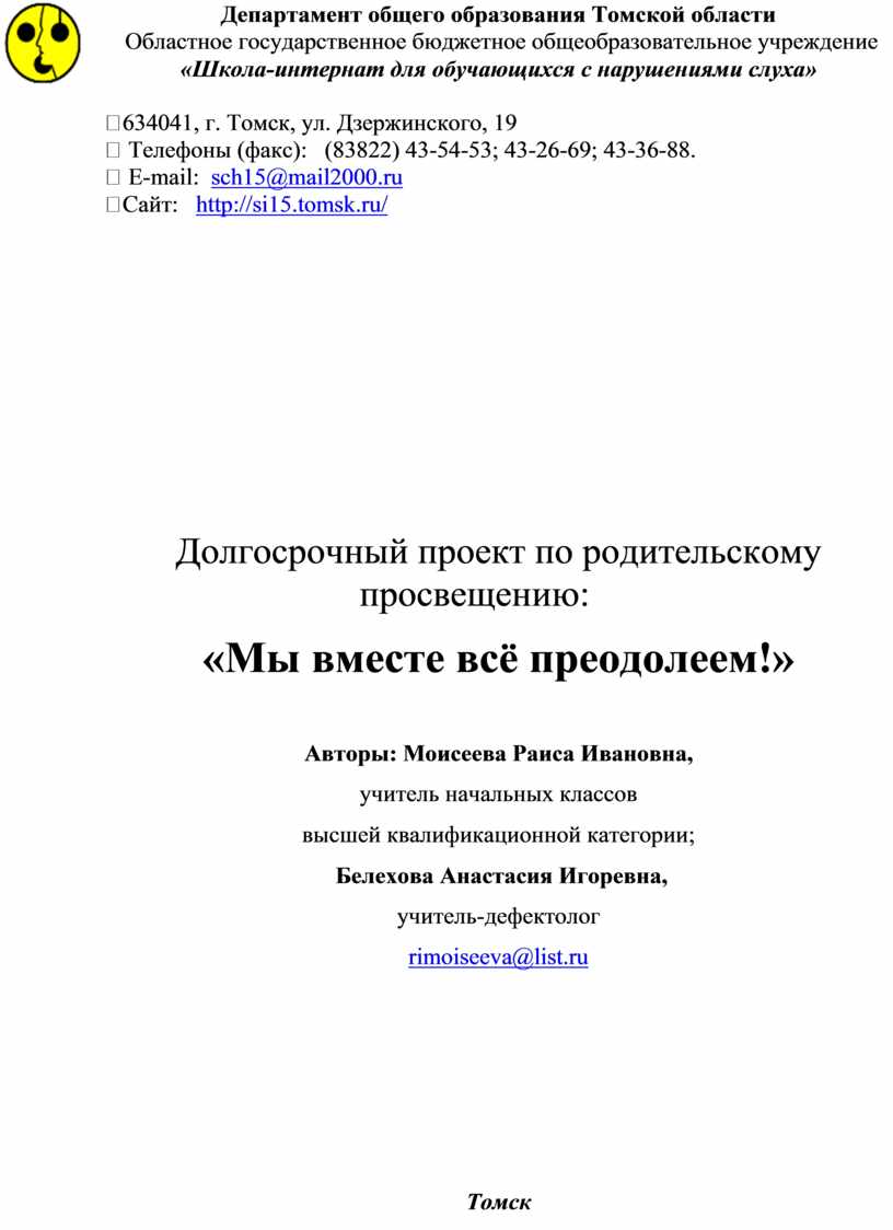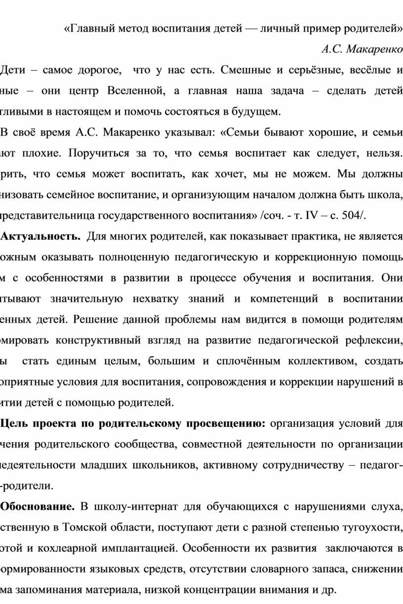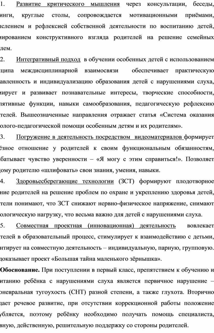 Обоснование. Необходимость и целесообразность сотрудничества и родительского участия в воспитании и образовании детей, в том числе их психолого-педагогического просвещения, заключается в обеспечении компетентности в вопросах психологии и педагогики. Дети-инвалиды по слуху нуждаются в особой организации коррекционно-воспитательно-образовательной деятельности, формах, приёмах, методах, адекватным их возможностям с обязательным вовлечением родителей в образовательный процесс с целью формирования конструктивного взгляда родителей на развитие и воспитание.