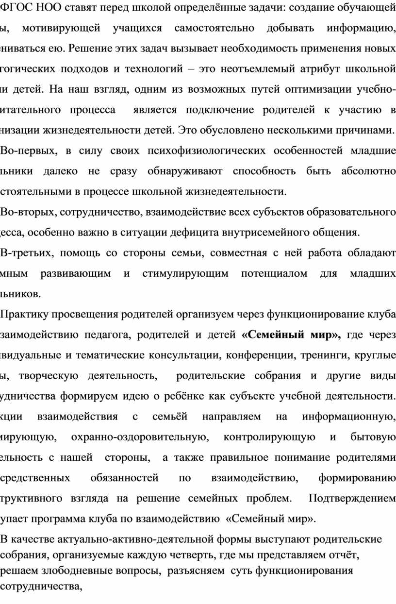 Практику просвещения родителей организуем через функционирование клуба по взаимодействию педагога, родителей и детей «Семейный мир», где через индивидуальные и тематические консультации, конференции, тренинги, круглые столы, творческую деятельность, родительские собрания и другие виды сотрудничества формируем идею о ребёнке как субъекте учебной деятельности. Функции взаимодействия с семьёй направляем на информационную, формирующую, охранно-оздоровительную, контролирующую и бытовую деятельность с нашей стороны, а также правильное понимание родителями непосредственных обязанностей по взаимодействию, формированию конструктивного взгляда на решение семейных проблем. Подтверждением выступает программа клуба по взаимодействию «Семейный мир».