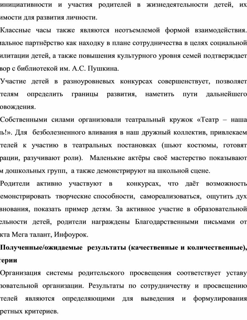 В качестве актуально-активно-деятельной формы выступают родительские собрания, организуемые каждую четверть, где мы представляем отчёт, решаем злободневные вопросы, разъясняем суть функционирования сотрудничества, инициативности и участия родителей в жизнедеятельности детей, их значимости для развития личности.