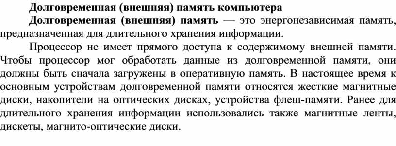 Долговременная (внешняя) память — это энергонезависимая память, предназначенная для длительного хранения информации.