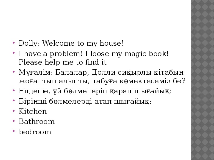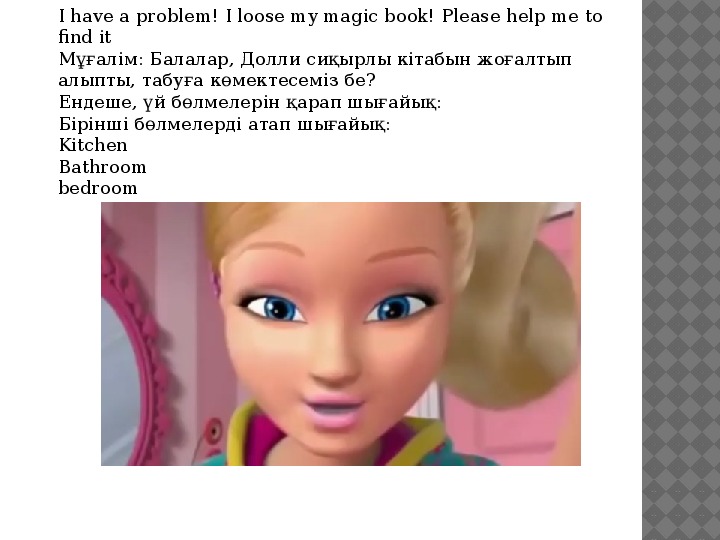 Мұғалім: Балалар, Долли сиқырлы кітабын жоғалтып алыпты, табуға көмектесеміз бе?