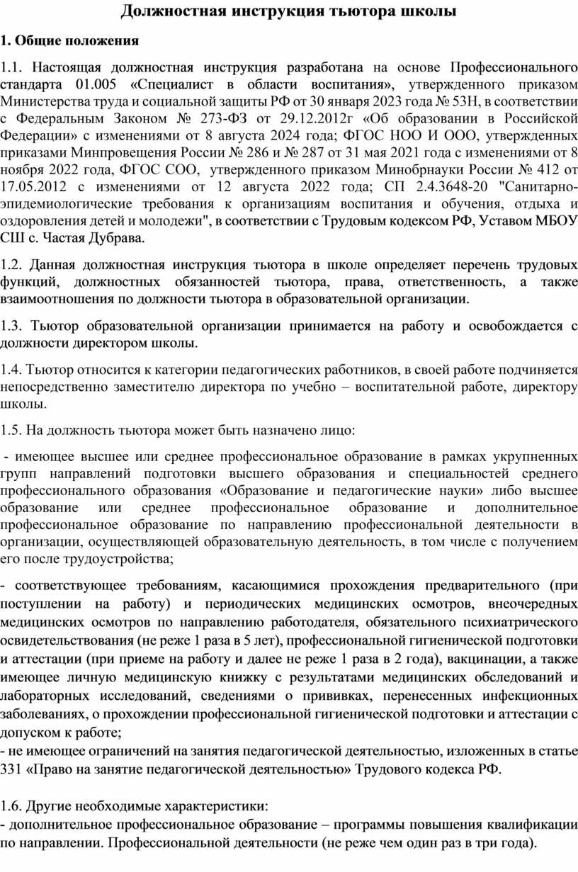1.1. Настоящая должностная инструкция разработана на основе Профессионального стандарта 01.005 «Специалист в области воспитания», утвержденного приказом Министерства труда и социальной защиты РФ от 30 января 2023 года № 53Н, в соответствии с Федеральным Законом № 273-ФЗ от 29.12.2012г «Об образовании в Российской Федерации» с изменениями от 8 августа 2024 года; ФГОС НОО И ООО, утвержденных приказами Минпровещения России № 286 и № 287 от 31 мая 2021 года с изменениями от 8 ноября 2022 года, ФГОС СОО, утвержденного приказом Минобрнауки России № 412 от 17.05.2012 с изменениями от 12 августа 2022 года; СП 2.4.3648-20 "Санитарно-эпидемиологические требования к организациям воспитания и обучения, отдыха и оздоровления детей и молодежи", в соответствии с Трудовым кодексом РФ, Уставом МБОУ СШ с. Частая Дубрава.