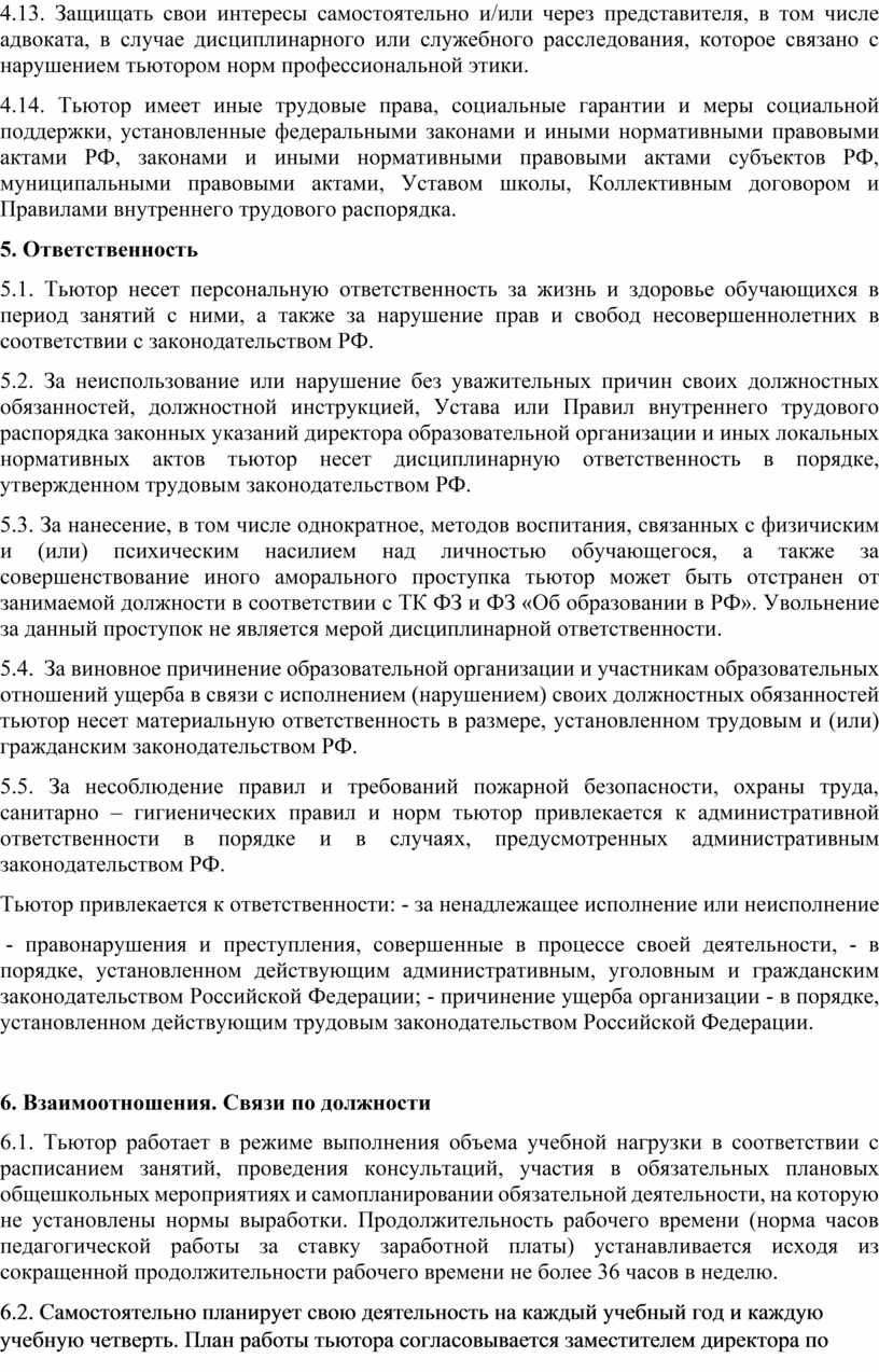 5.2. За неиспользование или нарушение без уважительных причин своих должностных обязанностей, должностной инструкцией, Устава или Правил внутреннего трудового распорядка законных указаний директора образовательной организации и иных локальных нормативных актов тьютор несет дисциплинарную ответственность в порядке, утвержденном трудовым законодательством РФ.
