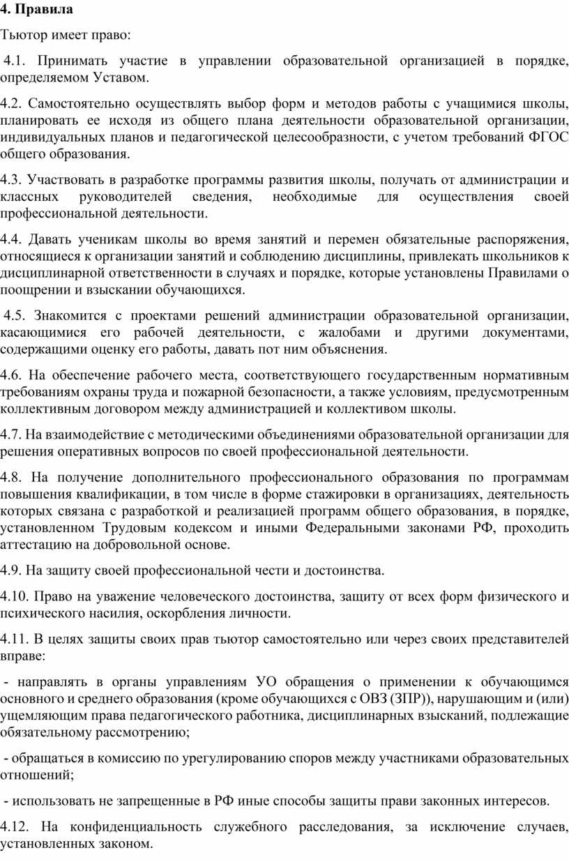 4.14. Тьютор имеет иные трудовые права, социальные гарантии и меры социальной поддержки, установленные федеральными законами и иными нормативными правовыми актами РФ, законами и иными нормативными правовыми актами субъектов РФ, муниципальными правовыми актами, Уставом школы, Коллективным договором и Правилами внутреннего трудового распорядка.