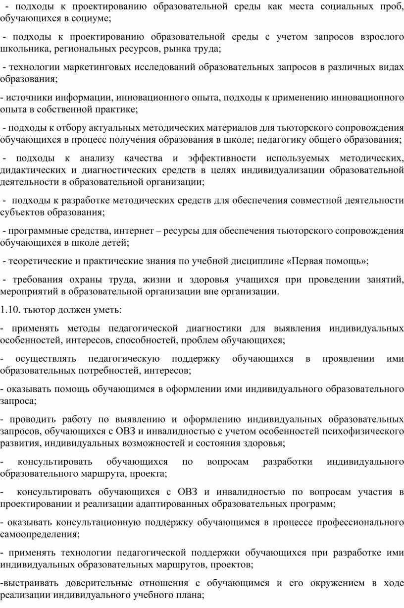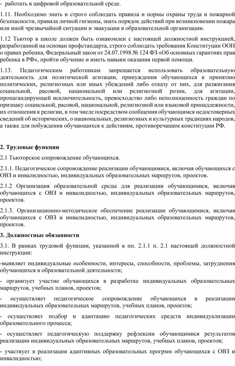 1.12 Тьютор в школе должен быть ознакомлен с настоящей должностной инструкцией, разработанной на основан профстандарта, строго соблюдать требования Конституции ООН о правах ребенка, Федеральный закон от 24.07.1998 № 124 ФЗ «Об основных гарантиях прав ребенка в РФ», пройти обучение и иметь навыки оказания первой помощи.