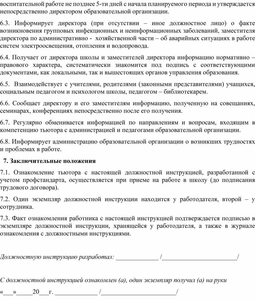 7.1. Ознакомление тьютора с настоящей должностной инструкцией, разработанной с учетом профстандарта, осуществляется при приеме на работе в школу (до подписания трудового договора).