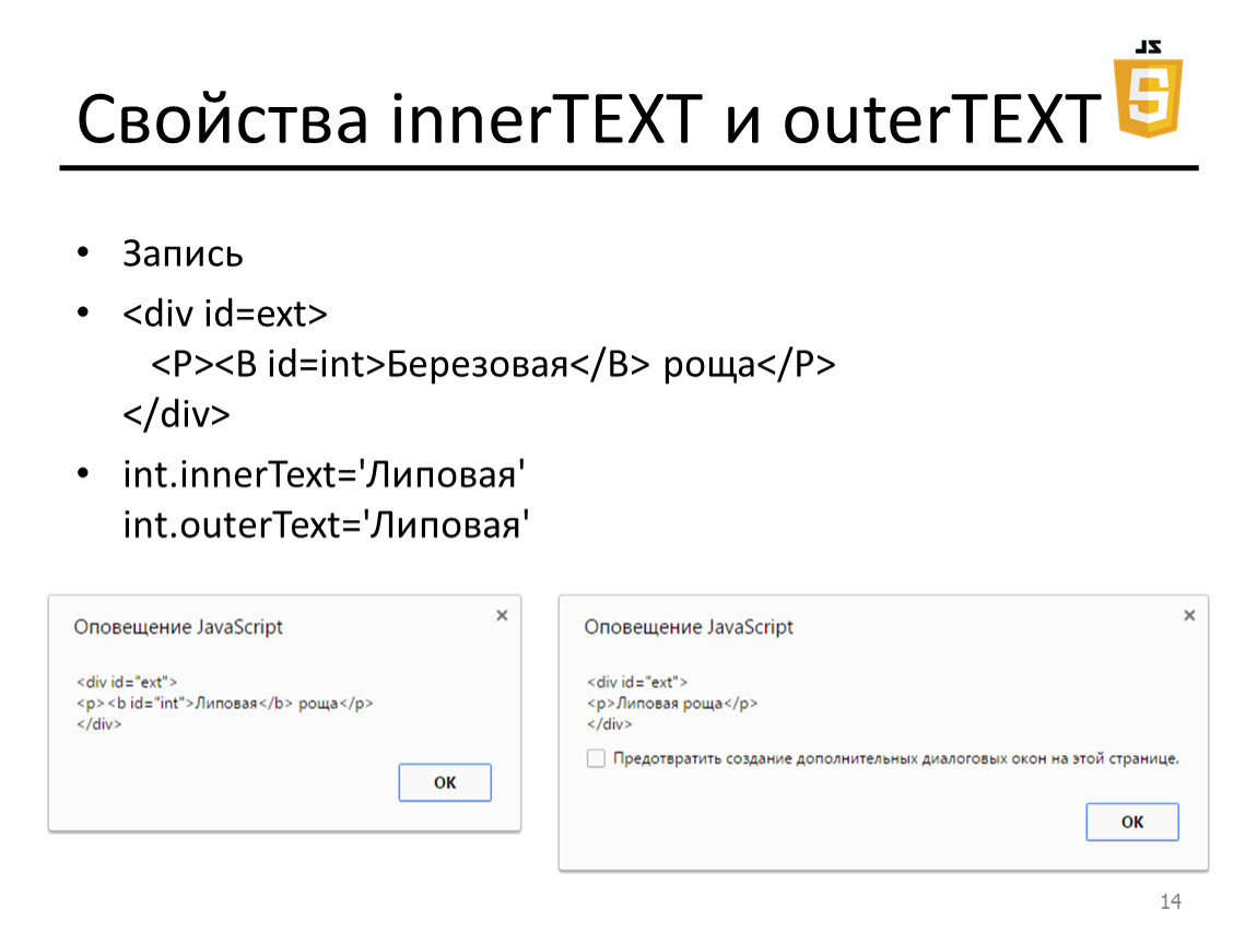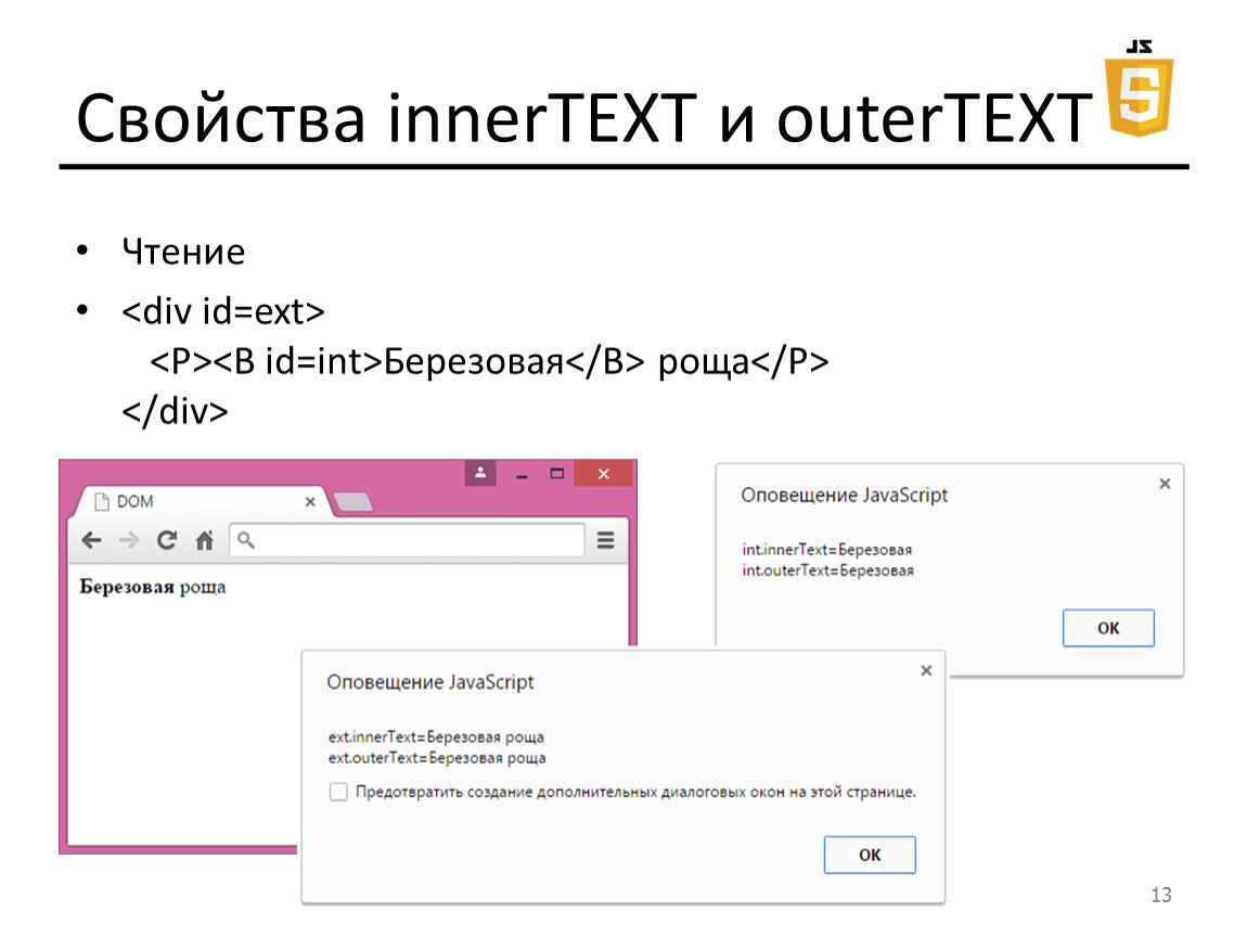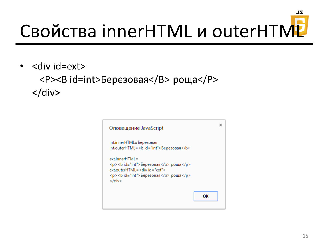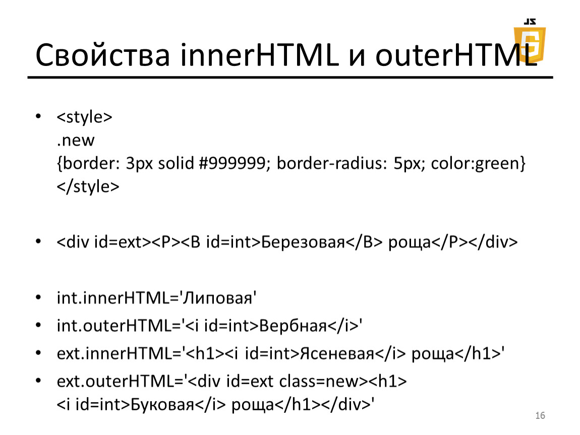 outerHTML – содержит текст и HTML-элементы для данного и вложенных тегов (html-узел целиком)