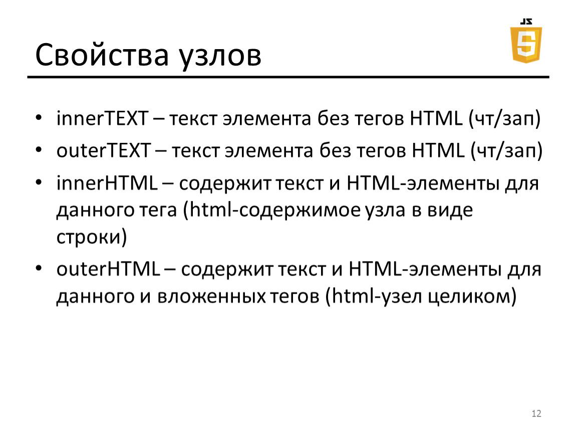 innerHTML – содержит текст и HTML-элементы для данного тега (html-содержимое узла в виде строки)