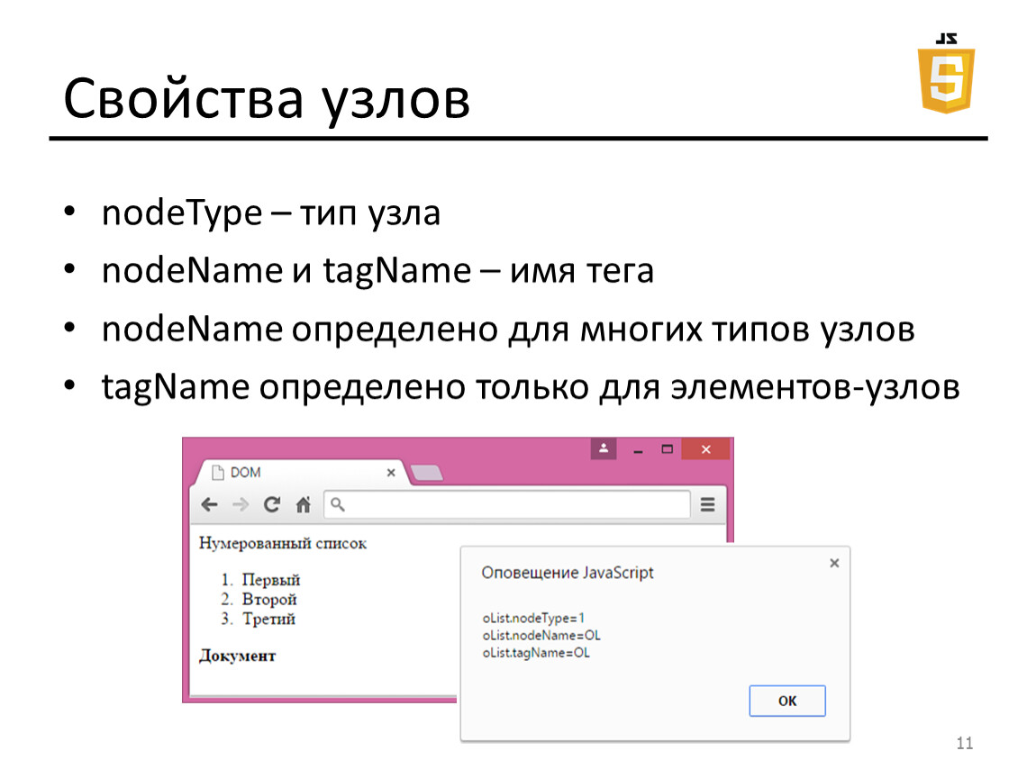 Всего существует 12 типов узлов, основных узлов два: узел-элемент и узел-текст