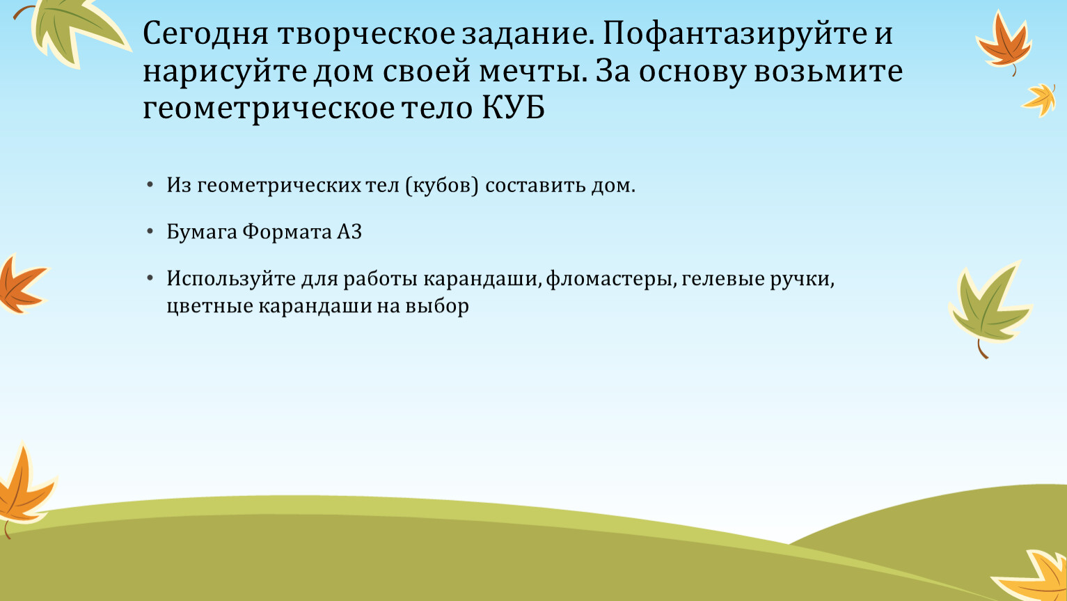 Сегодня творческое задание. Пофантазируйте и нарисуйте дом своей мечты. За основу возьмите геометрическое тело КУБ