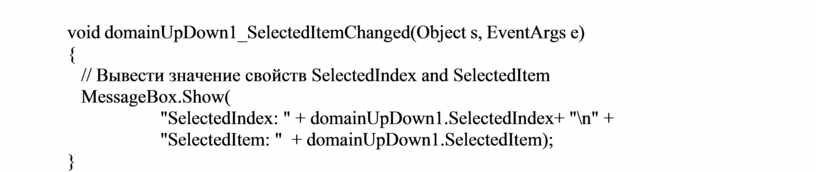 Элемент управления DomainUpDown отображает отдельное строковое значение, выделенное в коллекции Object путем нажатия на кнопки пе- редвижения вверх/вниз по элементам коллекции.