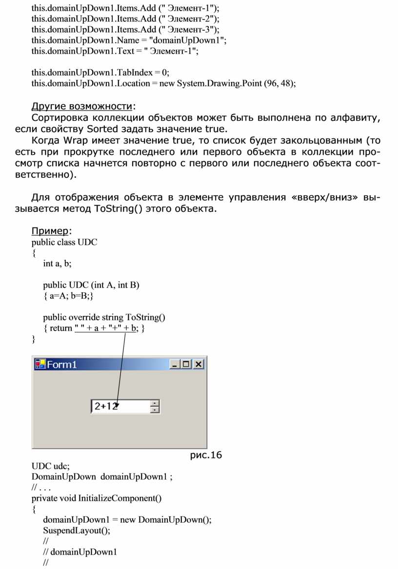 Для отображения объекта в элементе управления «вверх/вниз» вы- зывается метод ToString() этого объекта.