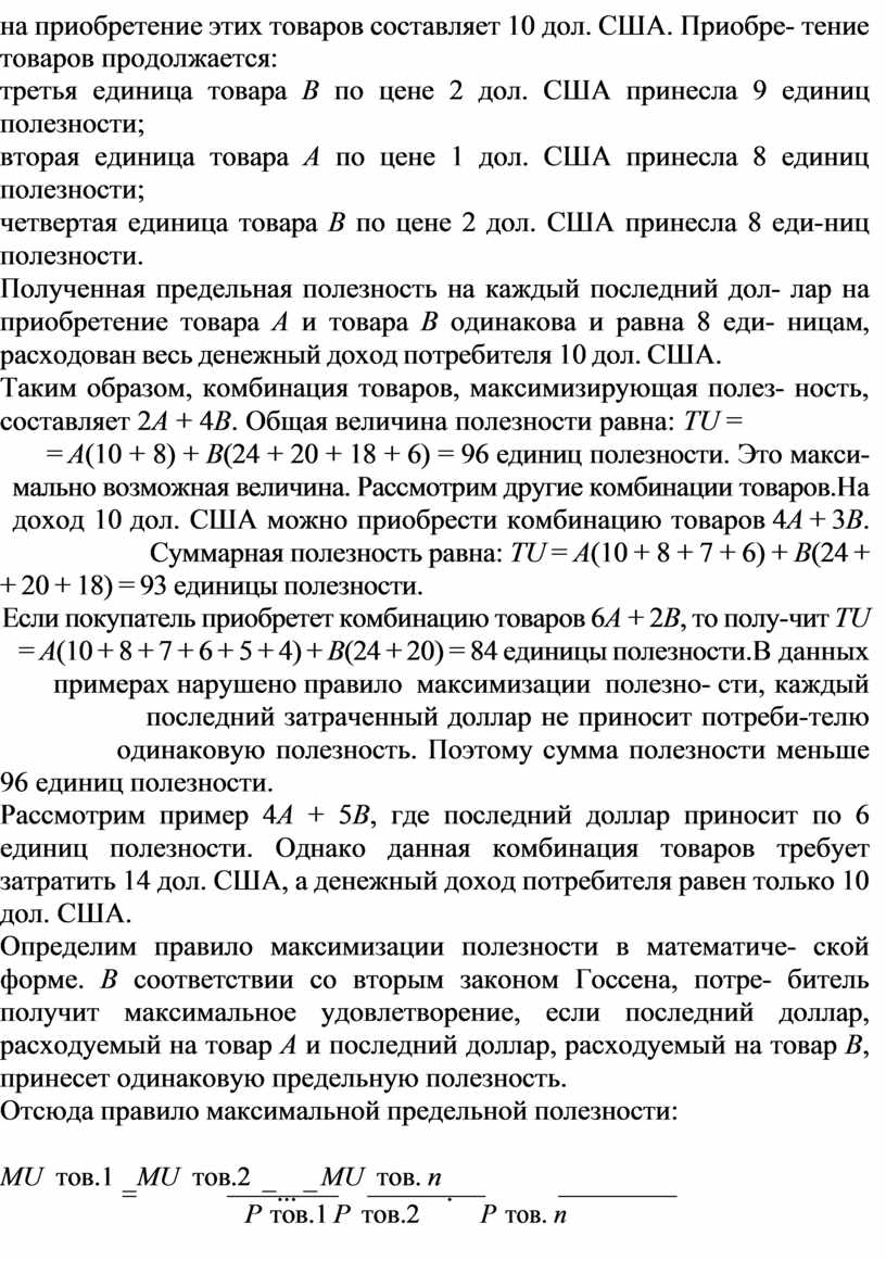 = А(10 + 8) + В(24 + 20 + 18 + 6) = 96 единиц полезности. Это макси- мально возможная величина. Рассмотрим другие комбинации товаров. На доход 10 дол. США можно приобрести комбинацию товаров 4А + 3В. Суммарная полезность равна: TU = А(10 + 8 + 7 + 6) + В(24 +