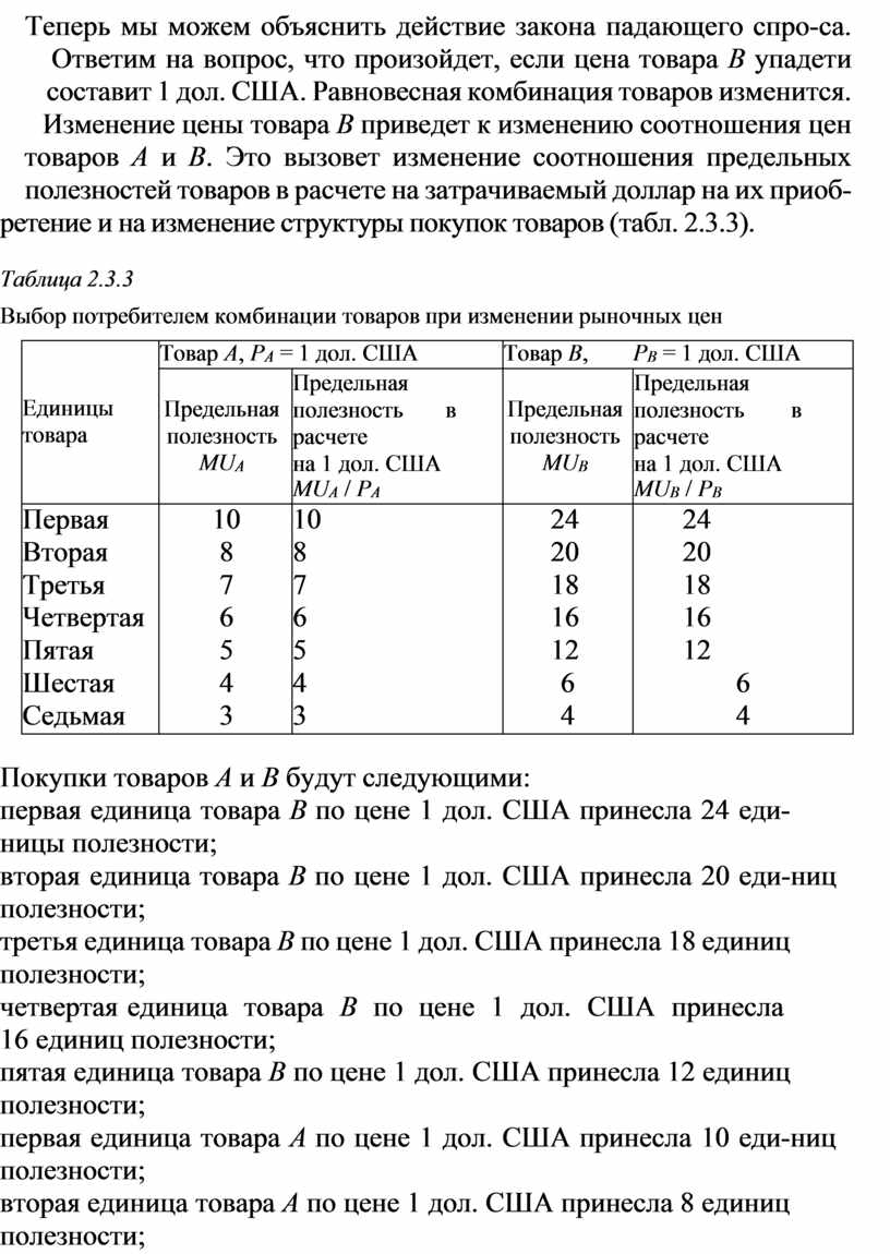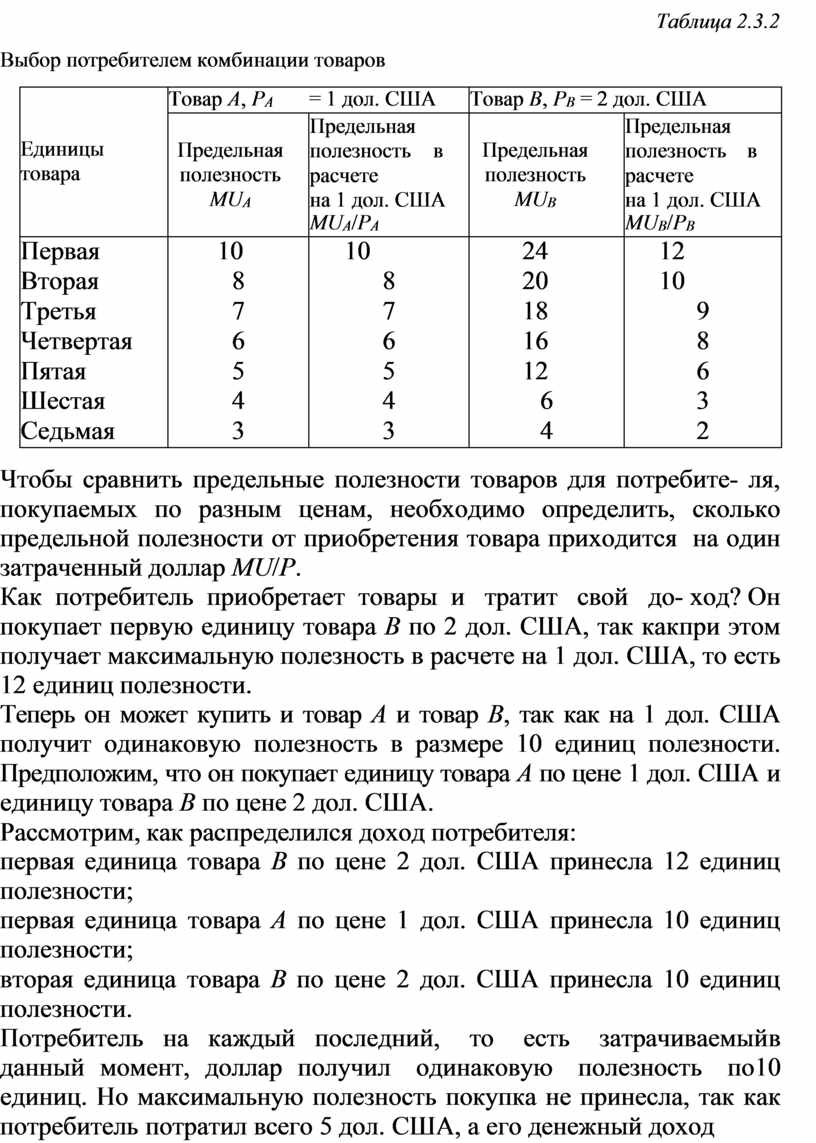 Пусть потребитель тратит свой доход в размере 10 дол. США на приобретение двух товаров (табл. 2.3.2).
