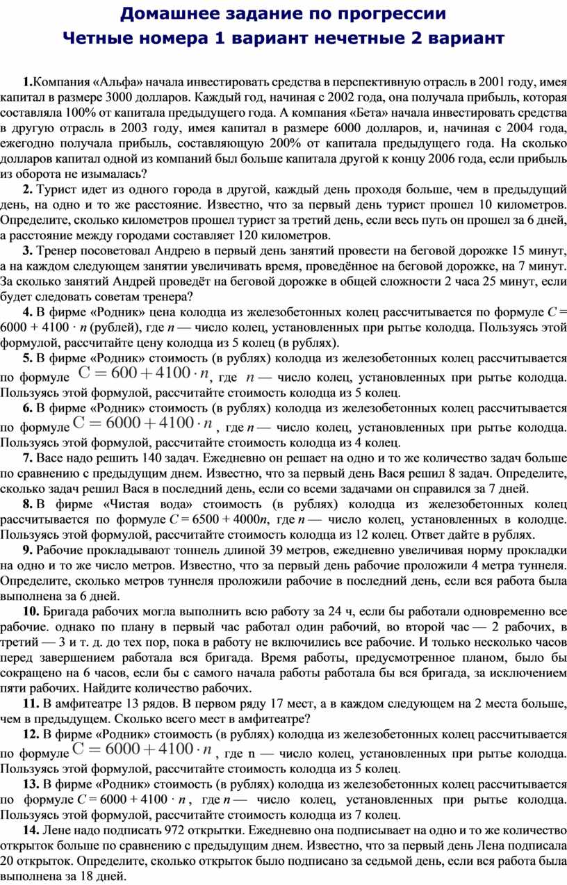 13. В фирме «Родник» стоимость (в рублях) колодца из железобетонных колец рассчитывается по формуле C = 6000 + 4100 · n , где n — число колец, установленных при рытье колодца. Пользуясь этой формулой, рассчитайте стоимость колодца из 7 колец.