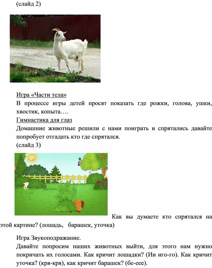 Давайте попросим наших животных выйти, для этого нам нужно покричать их голосами. Как кричит лошадки? (Ии иго-го). Как кричит уточка? (кря-кря), как кричит барашек? (бе-еее).