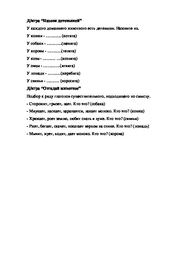 Слова – предметы: кошка- котята, собака- щенята, корова- телята, коза- козлята, овца- ягнята, лошадь- жеребята, свинья- поросята.
