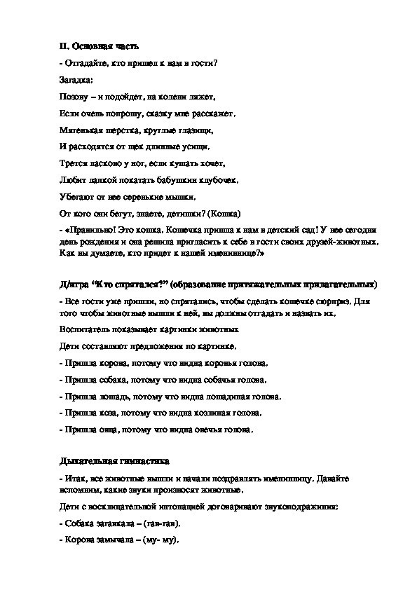 - «Правильно! Это кошка. Кошечка пришла к нам в детский сад! У нее сегодня день рождения и она решила пригласить к себе в гости своих друзей-животных. Как вы думаете, кто придет к нашей имениннице?»