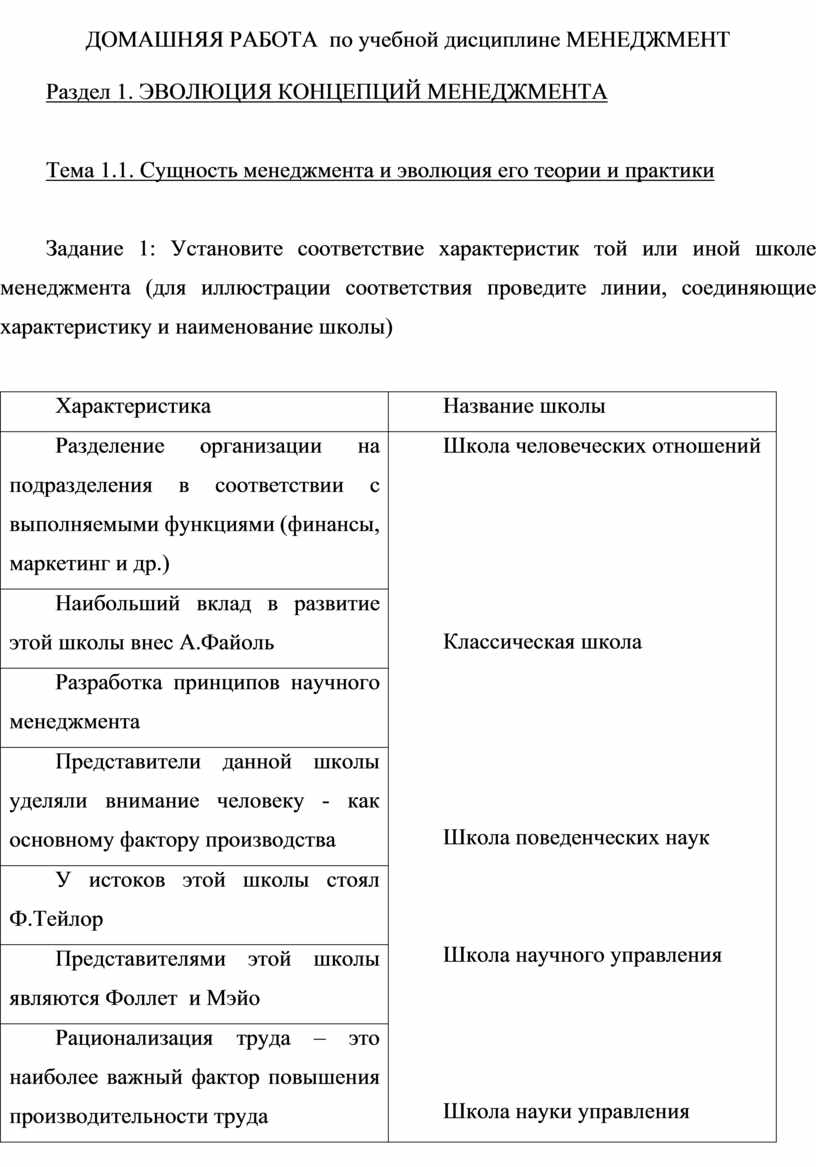 Задание 1: Установите соответствие характеристик той или иной школе менеджмента (для иллюстрации соответствия проведите линии, соединяющие характеристику и наименование школы)